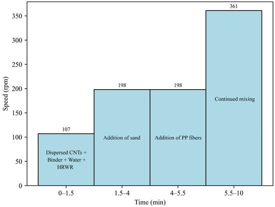 A Hobart-Model A200 mixer was employed to mix the materials. The mixing was completed in four stages at 16 ± 2 °C, over the course of ten minutes, as illustrated in Figure 4. The mixer was paused at 1.5, 4, and 5.5 min to remove the adhering materials from the sides and bottom of the bowl. The mortar mixtures were poured into wooden molds, and they were de-molded after 24 hours, followed by 28 days of water curing.