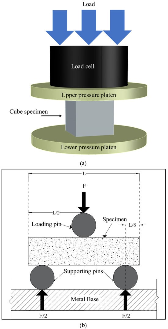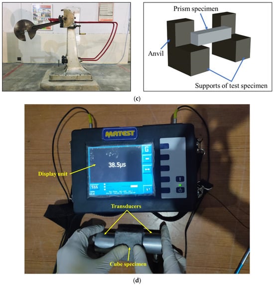 Appearances of different test assemblies: (a) Compressive strength test, (b) Flexural strength test (source of image: Yaseen et al. []), (c) Impact strength test, (d) Ultrasonic pulse velocity (UPV) test.