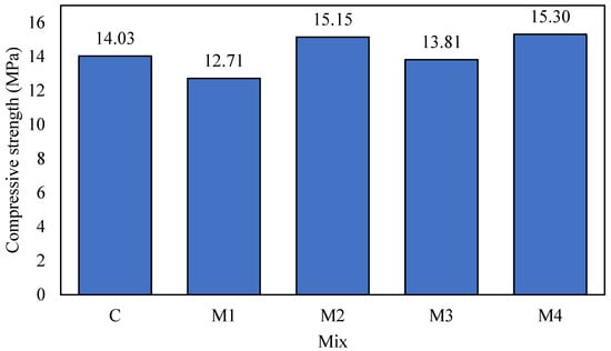 The compressive strength of mortar is a crucial factor in determining the appropriate type of mortar for construction purposes. ASTM C270 [] specifies the compressive strength for different types of mortars utilized in construction, such as the types M, S, N, and O. The determination of the appropriate type of mortar for a specific construction project is based on factors such as the required level of load-bearing capacity and the intended use of the structure []. For example, the type M mortar is specifically designed for applications where a high compressive strength is required. On the other hand, the type O mortar is suitable for low load-bearing structures where the compressive strength requirements are lower. Given the specifications set by ASTM C270 [], it can be seen that all the mixes in this study exhibited the compressive strengths greater than the minimum threshold of 12.40 MPa for the type S mortar, and an even higher value of 15.30 MPa was achieved in the case of mix M4. Thus, it is inferred that the investigated mortars have a variety of applications including masonry units, load-bearing walls, and other reinforced structural elements.