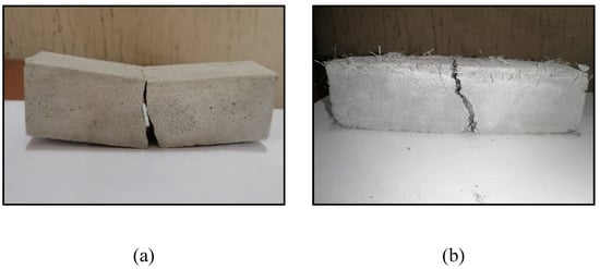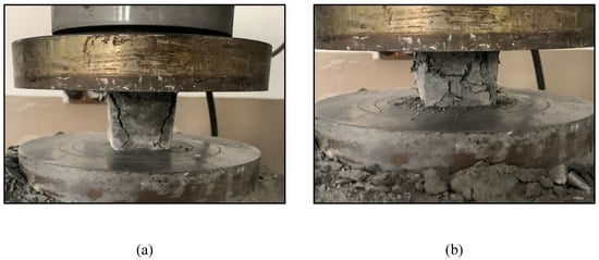 Mortar cubes without fibers, when subjected to compressive loading, revealed a crushing failure, whereas when the fibers were added to the cubes, the failure mode changed from crushing to bulging failure, which may have been owing to lateral and radial reinforcements (confinement) by PP fibers, as depicted in Figure 7. Similar failure patterns for the specimens reinforced with PP fibers have been observed in the literature as well []. This behavior is also consistent with what reported by previous research for SCBA-based composites having PVA fibers [].