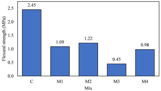 The flexural strength results are illustrated in Figure 8. The results of the flexural strength tests were consistent with those of the compressive strength tests, except the control mix that had the maximum strength. With the partial substitution of OPC with 15% SCBA, the flexural strength was decreased by 55%. This decrease is ascribed to the larger SCBA particles, which are porous and resulted in a weaker bond between the paste and aggregate interface [,]. In mix M2, the flexural strength was increased by 12%, which primarily was due to the densification and lateral and radial reinforcements provided by PP fibers, as elaborated earlier in Section 3.1.
