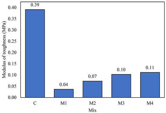The impact strength results in the form of the modulus of toughness are indicated in Figure 10. The impact strength of the control mix (C) was the maximum, and when 15% SCBA was added as a partial replacement for OPC, the impact strength of mix M1 was decreased by 90%. Similar results have been given in the literature []. In mix M2, with the addition of 1.5% PP fibers by weight of the binder, the impact strength was improved to 0.073 MPa thanks to the energy absorption capacity of PP fibers [].