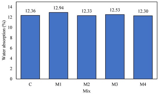 The results of the water absorption tests performed after 28 days are shown in Figure 11. The water absorption, when compared with the control mix, was increased by 4.7% with the replacement of 15% OPC with SCBA due to the porous zones created by SCBA in the cement–sand matrix [,]. Although in the literature, the volume of the voids both was increased and decreased with the inclusion of PP fibers followed by an increase and decrease in the permeability of the developed composites, respectively [,], the water absorption in the present research was decreased by 4.8% with the incorporation of PP fibers, which is an indication of a decrease in the volume of the voids.