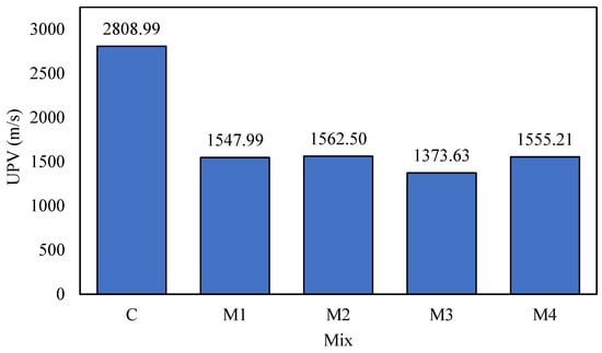 The results of the UPV tests, conducted to study the internal structure of the cementitious composites, are displayed in Figure 12. UPV of the control mix (C) was maximum but mix M1 demonstrated a decline of 44% due to the porous structure created by large-sized particles of SCBA in the internal matrix. Since the speed of sound is lesser in the air compared with in solids, UPV is reduced in cementitious composites with larger porosity [,,]. UPV of mix M2 was increased by 1% compared with M1 with the addition of 1.5% PP fibers by weight of the binder, indicating the densification of the internal matrix owing to the inclusion of PP fibers [,]. The initial incorporation of 0.04% CNTs in mix M3 decreased UPV by 12% with respect to M2, while UPV of mix M4 was increased to 1555.21 m/s with an increase of 13% as compared with M3. The improvement in UPV of M4 with a higher content of CNTs was because of the pore densification action of CNTs. The SEM micrographs, as are to be described in Section 3.6, confirm this behavior. Both the water absorption and UPV tests provided concrete evidence of the porous zones created by the additives, thus corroborating the results obtained from the mechanical tests.