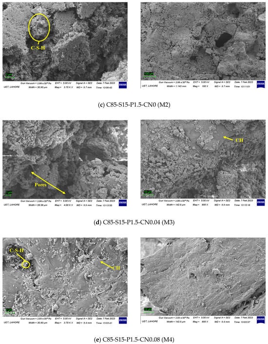 The SEM images of the developed cementitious composites at different magnifications, provided valuable insights into the composites’ microstructures and composition, are depicted in Figure 13.