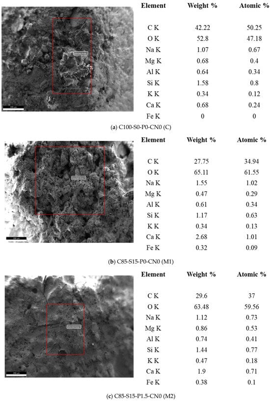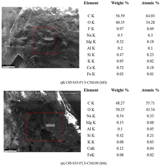 The EDS results for the five developed mixes are demonstrated in Figure 14. For the current study, the elements of interest are carbon (C), silicon (Si), oxygen (O), and calcium (Ca). Calcium, oxygen, and silicon signified the presence of CaO and SiO2, which revealed that C-H and C-S-H were formed during the hydration of OPC. The drops in the weights of calcium and silicon in M3, compared with mix M2, has made proof that MW-CNTs hindered the hydration process to some extent due to their hydrophilic nature, as depicted in Figure 14c,d. Moreover, Figure 14d,e showed a rise in the atomic weight of the carbon element in M3 and M4, indicating the existence of CNTs. As a result, the higher proportion of CNTs in the case of M4 could have filled in more pores in the matrix, leading to a more compact structure, as can be seen in Figure 14e, and thus, a higher compressive strength was achieved.