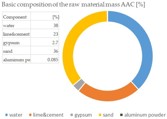 The term autoclaving is related to the process taking place in hermetically sealed autoclaves heated with fuel. There are two types of materials resulting from hydrothermal treatment: autoclaved sand-lime bricks and autoclaved concrete. Both in the case of AAC and silicates, the basic substrates used during their production are lime, sand and water (cement is also added to cellular concrete). The use of lightweight concrete, i.e., cellular concrete, is particularly important in the era of so-called development and ecological sustainable construction, which has its origin in the American continent. The production of aerated concrete is also based on two technologies: sand technology and ash technology (Table 1).