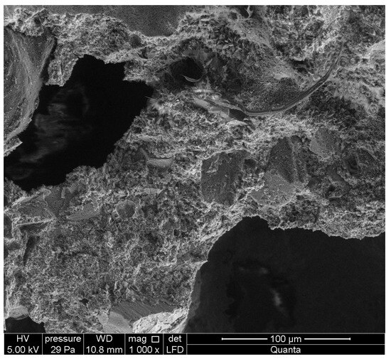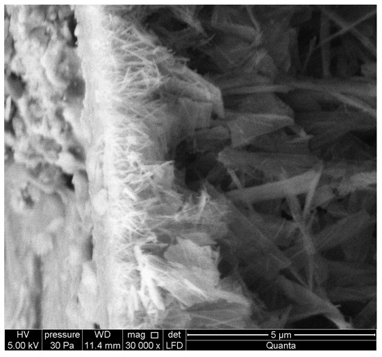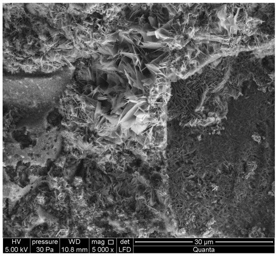 Photos Figure 8, Figure 9, Figure 10, Figure 11, Figure 12 and Figure 13 show the microstructure of ACC concrete with HIPS. The photos were taken using a scanning electron microscope. Photographs Figure 8 and Figure 9 show a well-crystallized tobermotite phase. Photo Figure 10 shows the EDS spectrum of ACC concrete with HIPS (elemental composition analysis). The next photos in Figure 11, Figure 12 and Figure 13 show pores in a block of HIPS-modified aerated concrete.