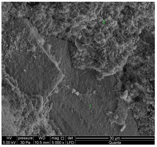 Microstructure of autoclaved aerated concrete (AAC); mag. 5000× (1—SiO2; 2—C-S-H).