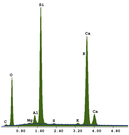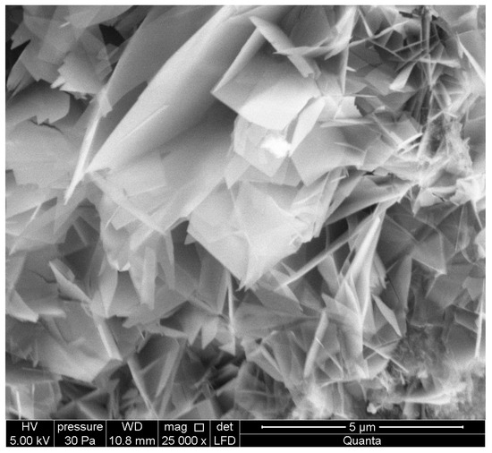 The tests were carried out using fluorescence X-ray analysis, mercury porosimetry, CT computed tomography and SEM analysis. Fluorescence X-ray analysis was performed to check the chemical composition of the sample undergoing modification. The analyses were based on two samples, R1 and R2. The weight of samples RD1 and RD2 was 2 g, and the chemical formula was: C38H76N2O2, which means that the chemical composition was not disturbed. Computed tomography and measurements of external and internal geometry were performed using the device Nikon XT H 225 ST computed tomography. The industrial CT scanner was designed for non-surface analysis and visualization studies that provide insight inside the material being examined. The test is especially designed for specimens that are too large or heavy for other systems with a similar measurement range. The system can be equipped with three types of sources: reflective 225 kV, transmissive 180 kV, and rotary 225 kV. Micro-CT analysis enabled measurements of the external and internal geometry of AAC with HIPS. The tests showed the presence of pores with a size of 0.1 ÷ 100 μm, and the volume of voids in the material was estimated at approximately 50% (RD1 52.53%) and around 47% for ACC with HIPS (RD2 47.33%) [1], while the average porosity of three samples, R2, R3, R4, was 52.52% [1]. The photos (Figure 4, Figure 5, Figure 6 and Figure 7) were taken using an SEM microscope (FEI Company). In aerated concretes, similarly to autoclaved bricks due to hydrothermal conditions, the C-S-H phase and crystalline tobermorite (Figure 4 and Figure 5) are formed, often called the C-S-H (I) phase. Photo Figure 6 shows an image of the porosity of aerated concrete, while Figure 7 shows the EDS spectrum, i.e., analysis of the elemental composition of ACC concrete.