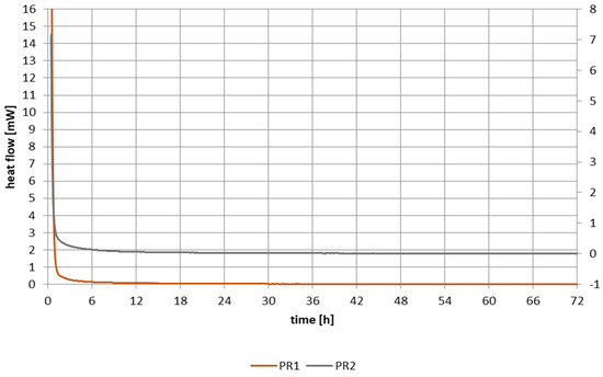 Calorimetry and thermal analysis (Figure 14) are used in virtually every one of the above-mentioned directions, mainly in comparative studies of hydration and its kinetics and the resulting products depending on the composition of the binder and its fineness and ratio water/cement, temperatures, etc. Isothermal calorimetry allows you to track the development of the heat of hydration (J/g) as well as the heat release rate (J/g/h) of cement materials as a function of time. Isothermal condition allow you to maintain a constant temperature during the test. An advantage of this method is the high precision of the measuring instrument compared to other semi-adiabatic or adiabatic methods [25]. The binder hydration process consists of five stages: a rapid initial period, an induction period, a period of increasing the reaction rate, and a delay and deceleration stage. The calorimetric measurement results for samples R1 and R2 with the modifier show that the hydration process in both cases is gradual and even. The addition of HIPS does not affect changes in the binder hydration process.