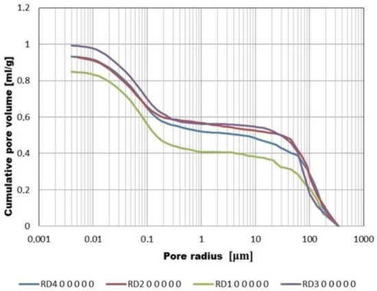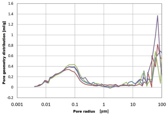Graphs Figure 16 and Figure 17 show the diameter and size distribution and arrangement of pores in traditional aerated concrete (R1—green curve) and modified HIPS (R2—red curve, R3—purple curve, R4—blue curve). As can be seen from the graphs, the curves have similar arrangements and pore arrangements. The porosity and connection of the base material, i.e., sand and binder with HIPS, are also influenced by technological factors, i.e., mixing and pressing of the raw material, and this may also lead to anomalies. The charts come from the publication in which the discussion and research on the porosity and properties of HIPS-modified aerated concrete began [1].