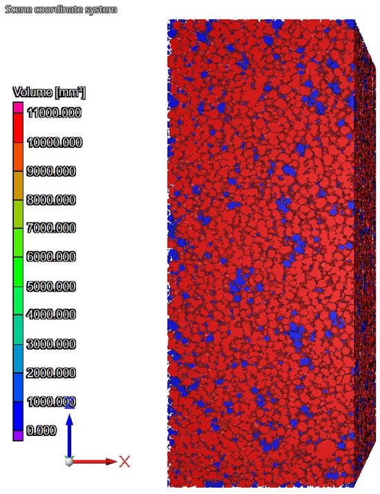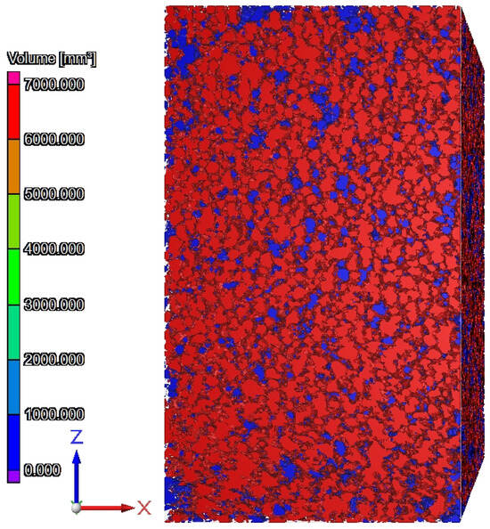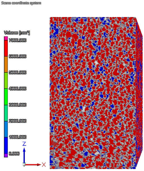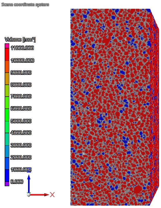 The photos in Figure 21, Figure 22 and Figure 23 show the shapes of closed and open pores in ACC concrete with HIPS. Photo Figure 21 shows an image of the basic material (raw material mass). The photo Figure 22 shows an image of the microstructure of the material with pores (red and blue colors are closed and open pores—total amount) and the basic material (raw material—gray). Photo Figure 23 show an image of the pore skeleton without raw material.
