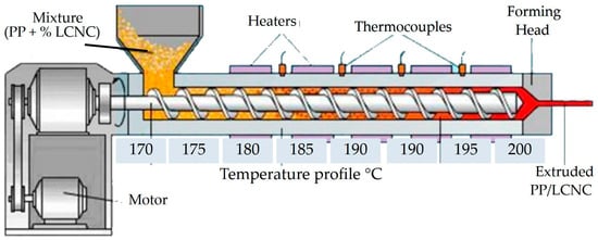 - Differential scanning calorimetry (DSC): To study the thermal transitions of pure PP and the PP/LCNC composite, the differential scanning calorimetry technique was used using the Perkin Elmer DSC equipment, Pyris DSC-6 (USA, TX, San Antonio), National University of Costa Rica, with a heating rate of 20 °C/min from room temperature to 250 °C in a nitrogen atmosphere. This energy difference was recorded as a spike on the DSC scan, indicating the temperature and energy of the transition.