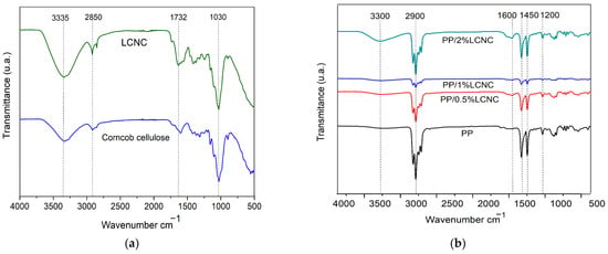 - Fourier-transform infrared spectroscopy (FTIR): FTIR analysis was carried out to determine the main functional groups on the LCNC/PP composite. The FTIR spectra were collected at a resolution of 4 cm−1 in transmission mode (4000–400 cm−1) using a FTIR spectrophotometer Alpha, Bruker (Germany, Berlin). The spectra were plotted using Origin Pro 2019 software.