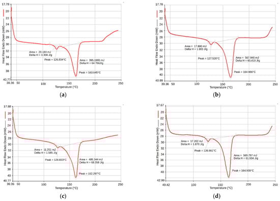 | Composite | Enthalpy ΔHf (J/g) | Crystallinity (%) | First Endothermic Peak (°C) | Second Endothermic Peak (°C) |