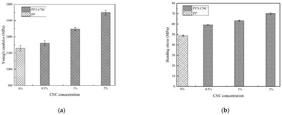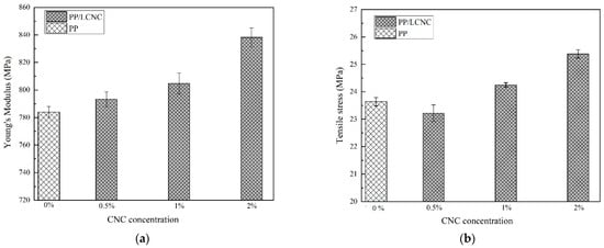 - Based on the results obtained from the mechanical tests, it was possible to demonstrate that the composite is resistant to traction and bending compared to pure recycled PP. Young’s modulus and bending strengths increase as the percentage of LCNC increases, and the tensile strength acts similarly to Young’s modulus.
