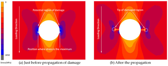 Stress concentration around a hole in a plate under compressive loading is shown in Figure 1a. When critical stress for initiation of damage under compressive loading is −1850 MPa, the potential region of damage is the blue area at the horizontal edge of the hole. In an implicit static FE analysis, load and/or displacement increment is usually set to relatively large value. Therefore, failure criteria are satisfied at a group of elements in the blue area during a single step of the analysis, but all these elements are not necessarily at the tip of the damaged region. If all elements in this area are degraded according to the law of Continuum Damage Mechanics, a wide region is incorrectly treated as failed.