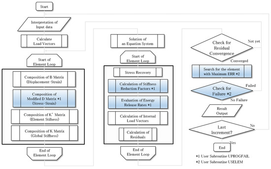 In the present study, the subroutines were implemented in Marc 2017 (MSC Software, Inc., Newport Beach, CA, USA). The flow of the program was implemented as shown in Figure 2. In an implicit static FE code such as Marc, the following incremental form of equilibrium equation is solved.
