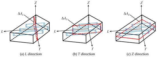 To express development of the damage, the energy release rate averaged in an element is evaluated and compared to mesoscopic fracture toughness of a lamina in the present method based on an idea that complex interactions between damage of constituents are detected as averaged apparent mesoscopic properties. It is reported by Pinho et al. that dependency of the solution on mesh density becomes small when smeared formulation, in which averaged energy release rate in an element is calculated, is adopted [24]. When the energy release rate in an element exceeds the fracture resistance of the material, the element is recognized as having failed, and rij of related failure mode is set to zero. We consider three principal planes of potential failure in L, T, and Z directions, which correspond to longitudinal direction to the fiber, transverse direction to the fiber, and thickness direction, respectively, as shown in Figure 3. Each component of energy release rate is calculated from components of strain energy density related to the planes of potential failure as follows.