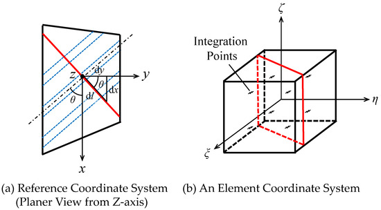 In the case of an 8-noded hexahedral element with low-order interpolation functions, the numerical integration in element coordinate system is conducted at 8 integration points shown in Figure 4b.