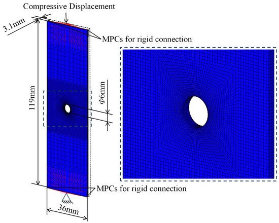 It is reported by Camanho et al. that the fracture toughness Gc for compressive fiber failure of the lamina can be experimentally evaluated [9], but it is not available for the material system used presently. Therefore, two reference values GcL = 10.0 kJ/m2 and 20.0 kJ/m2 were used in the present example. The fracture toughness for failure in transverse direction of the lamina was set as GcT = 2.0 kJ/m2. For the initiation of damage, any stress-based failure criterion mentioned in Section 1 fits the present method. Because of nearly uniaxial stress state in 0-degree layers where the damage is initiated first, the maximum stress criterion with Xc = 1850 MPa was adopted in this example. Nodes in the clamped area were rigidly connected to a representative node with MPCs as shown as red lines in Figure 5, and the boundary conditions of fixed displacement were defined to the representative nodes to apply the compressive load.
