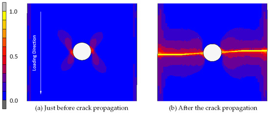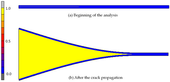 Deformed Shape and Damaged Region before and after the Crack Propagation.