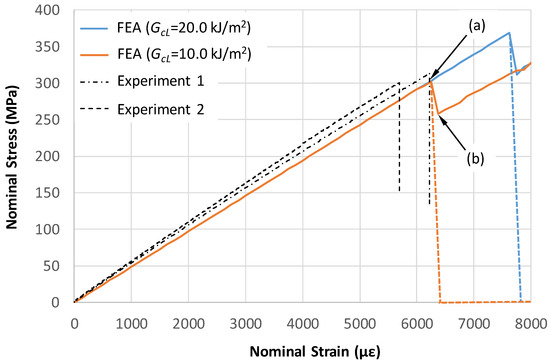 Figure 9 shows the relationship between the nominal strain and nominal stress obtained from the analyses with GLc = 10.0 kJ/m2 and 20.0 kJ/m2. Solid and dashed lines indicate the results with consideration of damage in the L direction and that with damage in the L and T directions, respectively. Points marked with (a) and (b) correspond to the distribution of damage shown in Figure 5 and Figure 6. The analytical results are compared to the experimental results. The peak stress from the analytical results with GLc = 10.0 kJ/m2 agreed with that in the experiment, i.e., the strength of the specimen, although the stiffness is slightly different. The strengths of the specimen in the experiments are in a range between the two peak stresses in the analyses.