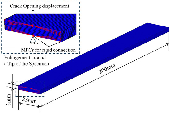 Finite element analyses with the present method were conducted to model Double-Cantilever Beam Tests. The test is experimental method to evaluate fracture toughness for delamination, but the present method can be applied to model it by enabling damage in thickness direction. A theoretical result of relationship between load and displacement is available for the test although it is based on an isotropic material [36]. The results from the analyses were compared to the theoretical result as a reference. Eight-noded hexahedral elements were used to create the model shown in Figure 10. An orthotropic elastic material with principal axis aligned to longitudinal direction of the specimen was used. The same material properties in the previous example were used for this model. Damage in z direction with reference value of fracture toughness GZc = 1.0 kJ/m2 was considered to model delamination. Whole model is considered as a region of potential failure, and an initial crack was modeled by setting damage parameters for elements located at initial crack as failed status from the beginning of the analysis. Nodes at loading edges were rigidly connected to representative nodes with MPC as shown as red lines in Figure 10, and boundary conditions of fixed displacement were defined to the representative nodes to apply crack opening displacement. Models with 3 different number of elements, 2700, 5500 and 10,200 were analyzed to test dependency of the solution on mesh density. Since the results were supposed to be affected by not only number of elements but also aspect ratio of the element, the aspect ratio for these models was kept as close as possible. Ratio of element size in longitudinal direction to that in thickness direction was set to about 2.0 in all models. To test dependency of the solution on loading history, 2 different number of load steps for an analysis, i.e., time steps, were chosen, and models with 2 different length of initial cracks, 30 and 60 mm were analyzed.