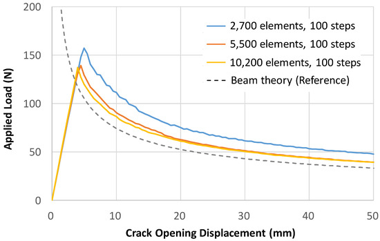 In the present study, averaged energy release rate in an element is calculated to evaluate condition of damage propagation with reference to the smeared formulation proposed by Pinho et al. [24]. This method was adopted in the aim of a reduction in the dependency of the solution on mesh density. The dependency in the present study was expectedly small as the previous study reported. In Figure 10, the results became closer to the reference results as mesh density was increased. However, the difference between the results was small for the difference of number of elements as many as 2 times. The difference in peak loads between the analyses with 2700 and 5500 elements was about 7%, and that between the analyses with 5500 and 10,200 elements was about 1%. These results indicate that the dependency is sufficiently small to apply the present method to analyses with a wide variety of element sizes without losing accuracy.