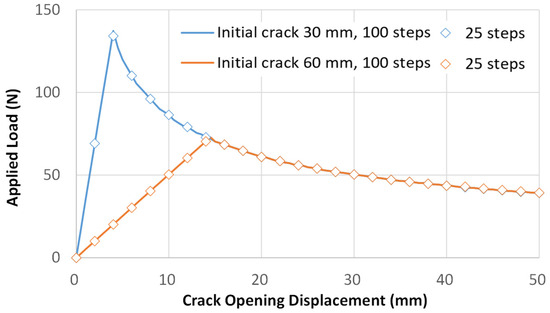 Figure 13 shows relationship between applied load and displacement from analyses with different number of steps and lengths of initial crack. Solid lines indicate results from analysis with 100 steps, and diamond-shaped markers indicate results from analyses with 25 steps. The results with large load increment were almost same as that with the 1/4th of load increment. Blue and Orange lines are results with different lengths of initial cracks. Initial slope of load–displacement curve was constant, which means that the crack did not start to propagate. The stiffness gradually decreased after the crack started to propagate. The peak points were different for 2 lengths of initial cracks because of difference of initial stiffness of the beams, but the same path was tracked during the crack propagation in the 2 analyses.