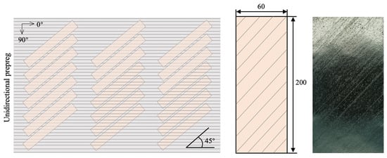 Unidirectional carbon fiber/epoxy resin prepreg, brand PD230211, with T300-grade carbon fibers and a resin mass fraction of 35% (areal density: 400 g/m2), was procured from Avic Composites Co., LTD, Beijing, China. The prepreg was stored at −20 °C and required thawing for 12 h at 25 °C before use. Test specimens were cut using a cutting machine (model DCS-2506-24, purchased from Gerber Company) with a fiber angle of 45°. During cutting, strict measures were taken to ensure the accuracy of the prepreg fiber angle, minimizing its impact on the test results. The cutting method, dimensions, and physical appearance of the specimens are shown in Figure 1.