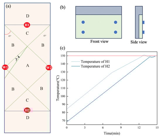 In-plane shear testing of unidirectional CF/epoxy prepreg: (a) concept of four shear characteristic zones and shear angle (γ); (b) fixture configuration; and (c) representative temperature collection curves of thermocouples at points H1 and H2, where the red line represents 150 °C.