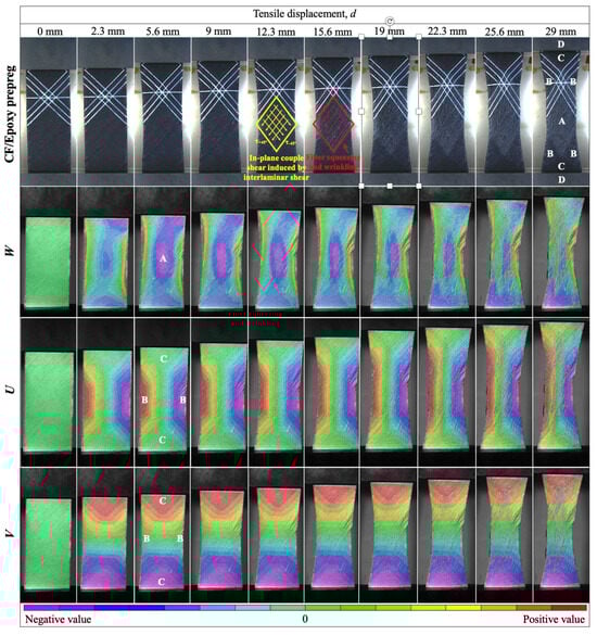 The tensile in-plane shear behavior of the uncured CF/epoxy prepreg with a ±45° layup is illustrated in Figure 4. With increasing displacement, the prepreg gradually elongates in the length direction, while uneven contraction occurs in the width direction. At high tensile displacements, noticeable fiber squeezing and wrinkles start to appear (red lines), accompanied by distinct dark and light zones on the specimen surface, corresponding precisely to the A, B, and C zones in Figure 2a. The deformation data (purple area) in the W direction distinctly reveal the evolution of zone A, transitioning from no initial shear behavior to gradually increasing shear behavior at d = 5.6 mm, which eventually disappears at d > 29 mm. The U-directional DIC map identifies symmetrical contraction in the two B zones, persisting until the end, while zone C shows no significant deformation in the width direction, maintaining a constant area. The V-directional map indicates that zone B undergoes no apparent deformation in the length direction, while the deformation in zone C is induced by tensile displacement, with no significant change in the area observed.