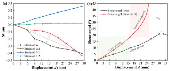(a) Strain–displacement curves of characteristic points H1, H2, W1, and W2 during in-plane shear testing process; (b) variation in theoretical and actual shear angles in zone A of the prepreg with tensile displacement.