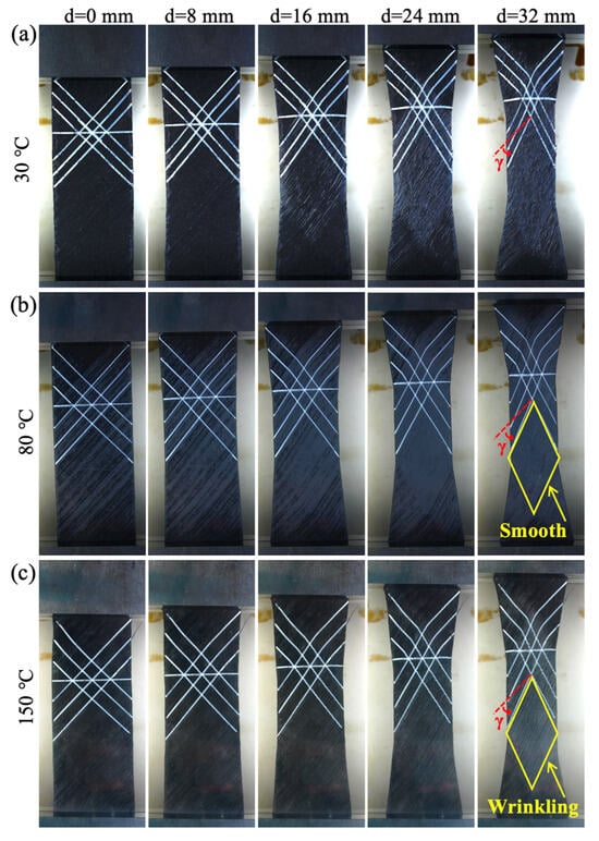 Digital images of in-plane shear testing of the CF/epoxy prepreg at different temperatures: (a) 30 °C, (b) 80 °C, and (c) 150 °C.