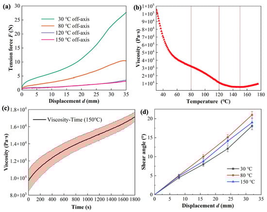 Impact of temperature on in-plane shear behaviors of the CF/epoxy prepreg: (a) deformation resistance forces of the prepreg; (b) viscosity–temperature curve of the prepreg; (c) viscosity–time curve of the prepreg at 150 °C; (d) variations in shear angles in specimens at different temperatures.