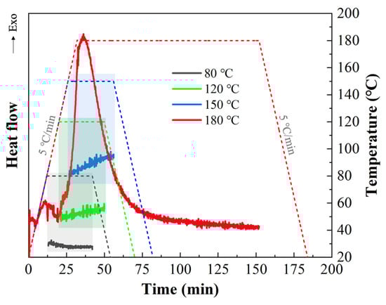 The evidence for the increase in viscosity and curing degree at different temperatures during shear testing is revealed in Figure 8. It can be seen that, under the curing temperature of 180 °C (red curve) recommended by the supplier, the CF/epoxy sample started to release heat during the heating stage, and it completed the entire curing process approximately 40 min after reaching 180 °C. In contrast, during the entire testing time, including heating to 80 °C, 120 °C, and 150 °C, and maintaining these temperatures for 30 min, no complete curing exothermic peaks were observed. However, through subtle observation and comparison of the slope of the heat flow curve, it can still be observed that the slopes increase with the increasing temperature, indicating the occurrence of slight curing, and the curing rate increases with the increasing temperature. However, within our limited testing time, corresponding to the time scale of in-plane shear testing, the overall degree of curing remains at a relatively low level. The above phenomenon well explains why the viscosity starts to increase after the temperature exceeds 150 °C in Figure 7b,c, and why the shear angle at 150 °C in Figure 7d is lower than that at 80 °C.