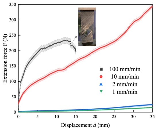 Figure 9 illustrates the influence of the tensile rate on the in-plane shear behavior of the prepreg. It is evident that the shear deformation resistance force of the prepreg is positively correlated with the tensile rate. Higher tensile rates result in greater shear deformation resistance. Notably, at a rate of 100 mm/min, the prepreg experiences direct tensile failure around d = 15 mm. This corresponds to the rapid increase in the mid-shear angle and resistance force, as shown in Figure 5b and Figure 7a. This is primarily attributed to the substantial viscous resistance of the resin at room temperature, wherein its high relaxation time hinders the epoxy resin from responding promptly under a high tensile rate, consequently leading to the in-plane shear failure of the prepreg. Therefore, in practical manufacturing processes of composite materials, it is essential to choose an appropriate laying rate to enhance the molding quality or elevate the temperature of the CF/epoxy prepreg to reduce the resin viscosity and improve the shear response speed, thereby achieving the enhanced manufacturing efficiency of the preform.