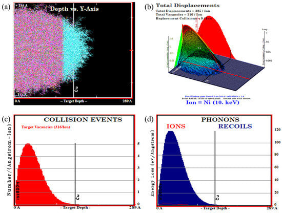 To obtain the displacement per atom (dpa) for each PKA, two methods were employed, which were the Stopping and Range of Ions in Materials (SRIM) [] code and the Norgett–Robinson–Torrens (NRT) equation []. The SRIM method is used to simulate the deposition trajectories and profiles of ions when they are exposed to high-energy beams. It also predicts the evolution of damage in materials subjected to impact from high-energy ions. There are two ways displacement damage parameters can be computed in SRIM, namely, the ‘Quick’ Kinchin Pease [] calculation and the Full Damage Cascade calculation. The input parameters used were as follows: The input layers consisted of one layer of Incoloy 800H (Ni32Cr21Fe47) and one layer of copper. Each layer had a depth of 144.32 Å, with nickel chosen as the incident ion. The angle of incidence of the Ni ion was 0°, and the energy of incidence was 10 keV. The Full Damage Cascade calculation was set to be the damage calculation method here. We used 99,999 incident ions to obtain statistical viability. Figure 1a shows the damage depth profile undergone by the Incoloy 800H–Cu model after the impact of 99,999 10 keV-irradiated incident ions. Figure 1b displays the displacement profile of the atoms in Incoloy 800H–Cu in a 3-D log-log plot, along with the number of vacancies and displacements. The damage in the form of the number of vacancies, which is used to calculate the dpa, is plotted against the target depth in Figure 1c. The energy loss due to irradiation is plotted against the target depth in Figure 1d.