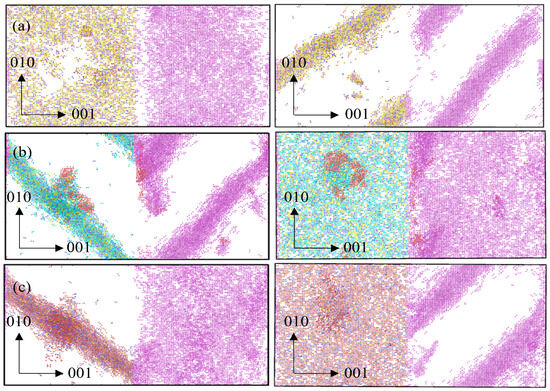 To obtain a robust statistical foundation, our MD simulations incorporated a minimum of three distinct seed velocities for each Inconel–Cu model, with an increase to four seed velocities for the Inconel 718–Cu model. In LAMMPS, the velocity of atoms is assigned during the initialization based on the simulation temperature, in a random fashion. To achieve different velocity distributions for a given temperature for statistical analysis, different numbers shall be selected as the seed of the random number generator for a given velocity distribution, which is called seed velocity. Here, we created a random seed number based on the atom’s xyz coordinates. Our results revealed that the introduction of a cascade via a PKA leads to the formation of Frenkel defect pairs, i.e., an equal number of vacancies and interstitials. Surprisingly, all Inconel–Cu models demonstrated a propensity for defect clustering, preferentially located along specific crystallographic planes within the copper and/or Inconel matrices after irradiation. These defect clusters manifested in three characteristic configurations shown in Figure 2 as follows: firstly, the clustering planes on both the Inconel and copper sides were oriented parallel to one another; secondly, these planes exhibited a mirrored arrangement; and thirdly, the planes were angularly disposed with respect to each other. Table 1 depicts the planes along which clustering, SF formation, and L-C lock formation happened in the different cases of each of the three models (video in Supplementary Materials). All the observed planes of defect clustering belonged to the {1 2 0} family of planes. The observed planes of SF formation and persistence, in the cases of Incoloy 800H–Cu and Inconel 718–Cu, belonged to the {1 2 2} family of planes, and these SF planes led to the formation of L-C locks in a couple of the cases of Incoloy 800H–Cu. When the SFs formed along the {1 2 0} family of planes, they were subsequently eliminated by the defect clustering process, which also happened along the same family of planes. These findings were corroborated through crystallographic analysis utilizing Crystal Maker version 11 []. Defect clustering was initiated only after the models underwent an irradiation damage value of ~0.045 dpa, i.e., after the incidence of ~120–130 PKAs. In the case of Incoloy 800H and Inconel 718, which had an atomic weight percentage of iron of 47% and 24%, respectively, defect clustering was observed at ~0.06 dpa damage. It occurred far more quickly in the case of Inconel 625, which had only 5% of iron in it.