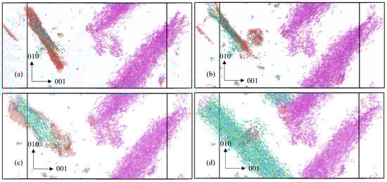 Clustering of defects along the SF plane in an Inconel 718–Cu model. (a) The formation of the SF plane (the red layer) at a dose of 0.076 dpa. (b) The start of the formation of defect clusters at a dose of 0.086 dpa. (c) The diminishing of the SFs occurs because of the elastic stress field created by the defect clusters at a dose of 0.09 dpa. (d) Defect clusters after eliminating the SF plane at a dose of 0.091 dpa. The visualization was performed using OVITO.