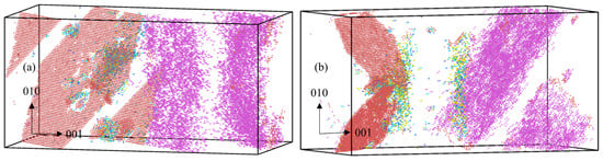 Irradiation-induced SFs [] were observed on the Inconel interface. The formation of defect clusters created an elastic stress field, which led to the diminishing and subsequent elimination of these SFs and resulted in SF planes being replaced by defect cluster planes (Figure 3 and video in Supplementary Materials). The detection of these SFs can be made feasible through transmission electron microscopy []. In Incoloy 800H–Cu, the third seed velocity led to the formation of SFs, forming (L-C) locks []. The persistence of SFs and L-C locks prevented the defect clustering from occurring. In Inconel 718–Cu, the first seed velocity led to the clustering of SFs along a distinct plane. The SF and L-C lock planes belonged to the {1 2 2} family of planes (Figure 4). In Inconel 625–Cu, SFs could not cluster and were quickly eliminated by defect clustering. Incoloy 800H–Cu and Inc 718-Cu had much higher iron content in comparison with Inconel 625–Cu, which explains the formation of SFs and L-C locks in Inc 718-Cu and Inc 800H-Cu and why SFs could not cluster in Inc 625-Cu.