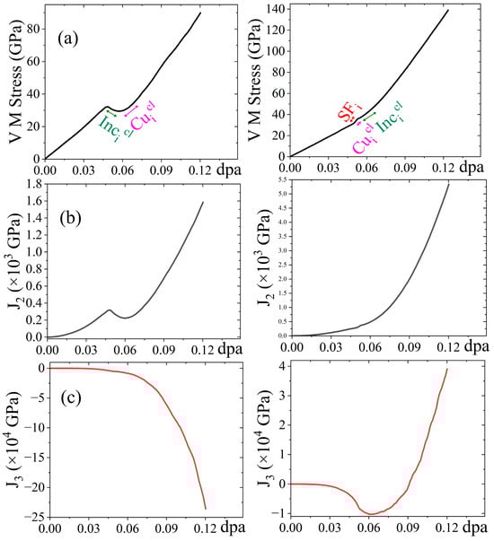 Impact of stress on clustering. (a) von Mises stress vs. dpa plots, (b) second deviatoric stress invariant (J2) vs. dpa plots, and (c) third deviatoric stress invariant (J3) vs. dpa plots for two seed velocities of Incoloy 800H–Cu. Cuicl represents the copper clustering part, Incicl represents the Inconel clustering part, and SFi represents the SF formation part.