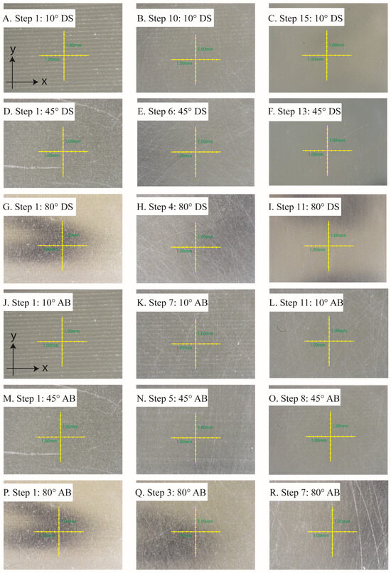 | Step | Grit | 10° | 45° | 80° | 10° | 45° | 80° | 10° | 45° | 80° | 10° | 45° | 80° | |
