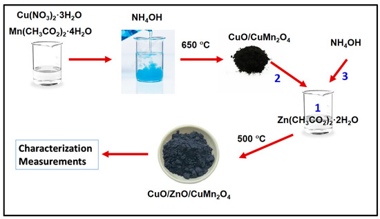 Schematic diagram of the synthesis method for CuO/ZnO/CuMn2O4 ternary composite.
