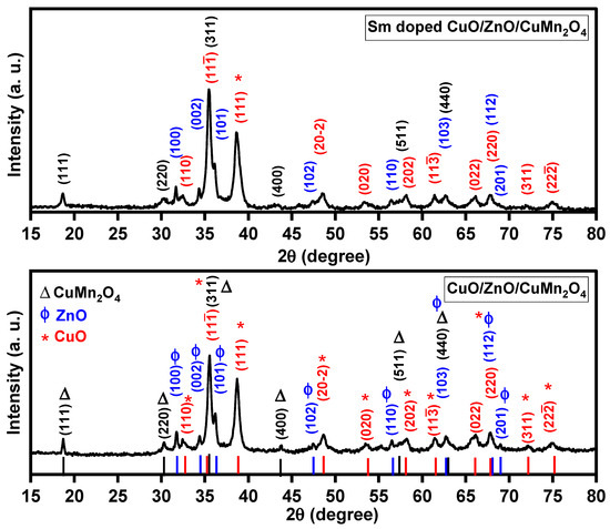 The X-ray diffraction (XRD) technique is used to analyze the crystalline structures of synthesized powders. Figure 2 displays the XRD results of pure and Sm-doped CuO/ZnO/CuMn2O4 tri-composites. The X-ray diffraction pattern of the pure CuO/ZnO/CuMn2O4 tri-composite revealed various peaks with different relative intensities. In Figure 2, the peaks at 2-theta values of 32.55°, 35.54°, 38.72°, 48.65°, 53.51°, 58.12°, 61.45°, 65.99°, 67.8°, 72.2°, and 75.94° were related to (110) (11-1), (111), (20-2), (020), (202), (11-3), (022), (220), (311), and (22-2) crystallographic planes of CuO with monoclinic phase in agreement with JCPDS (# 48-1548, space group: C2/c). Additionally, the pattern also displayed another series of XRD peaks at 2θ = 31.76°, 34.38°, 36.19°, 47.46°, 56.51°, 62.70°, 67.8°, and 68.99°, recognized for (100), (002), (101), (102), (110), (103), (112), and (201) crystallographic planes of the zinc oxide phase with hexagonal structure (JCPDS. # 36-1451, space group: p63mc). The XRD peaks that appeared at 2-theta values of 18.74°, 30.31°, 35.54°, 43.8°, 57.72°, and 62.7° coincide with the crystallographic planes of (111), (220), (311), (400), (511), and (440) for cubic CuMn2O4 spinel oxide in agreement with JCPDS (# 74-1921 space group: Fd-3m). The Sm-doped CuO/ZnO/CuMn2O4 tri-composite has a similar XRD pattern to the pure one, which proves the same composite structure formation, Figure 2. The broadening of the X-ray diffraction peaks was improved after Sm ions doping which supports the reduction in the crystallite size. The Scherer formula, as represented in Equation (1), was used to compute the average crystallite size of pure and Sm-doped CuO/ZnO/CuMn2O4 tri-composites through using the three main peaks of each phase [32]: