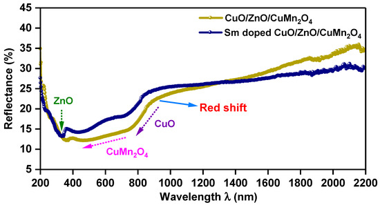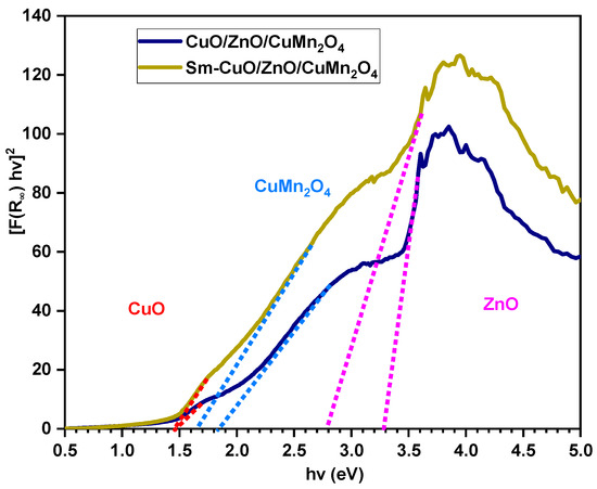 Figure 3 depicts the UV–visible diffuse reflectance spectra of pure and Sm-doped CuO/ZnO/CuMn2O4 tri-composites. As shown in Figure 3, the reflectance spectra of both composites display three reduction regions of intensity (%), which related to the individual absorption edge of each phase including CuO, ZnO, and CuMn2O4 structures. It can be seen that these absorption edges were moved to a low energy direction after doping by Sm ions. This behavior signifies that the Sm-doped CuO/ZnO/CuMn2O4 tri-composite has a more harvesting of visible light spectrum compared to pure sample. As reported for metal oxides, perovskites, and composites materials, the formula of Tauc method can be used to compute the band gap energy of pure and Sm-doped CuO/ZnO/CuMn2O4 samples as shown in Equation (2) [33,34]: