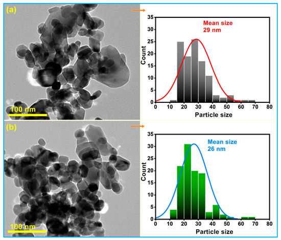 TEM images with corresponding particle size distribution histograms of (a) pure and (b) Sm-doped CuO/ZnO/CuMn2O4 tri-composites.