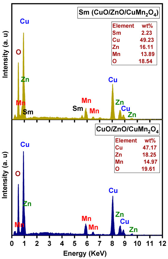 EDX patterns of pure and Sm-doped CuO/ZnO/CuMn2O4 tri-composites.